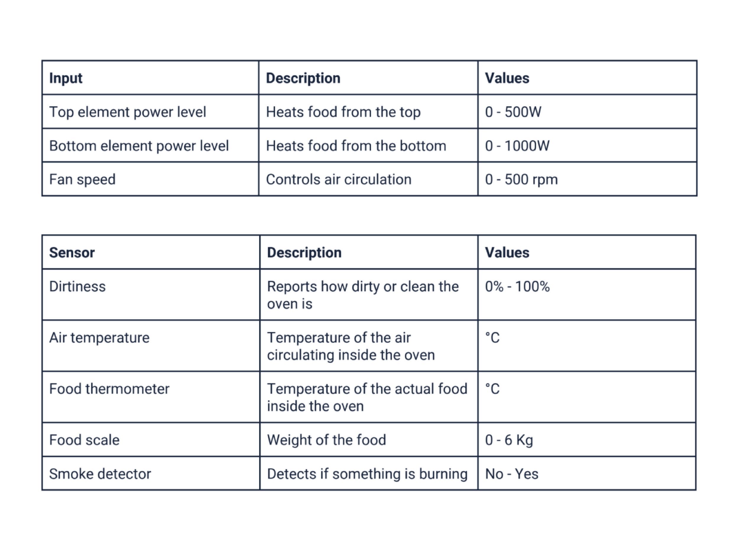 Thanks to wireless connectivity and a bunch of inputs and sensors the oven can potentially communicate all this information to and from the app. These are not requirements, just the ingredients we can take advantage of.