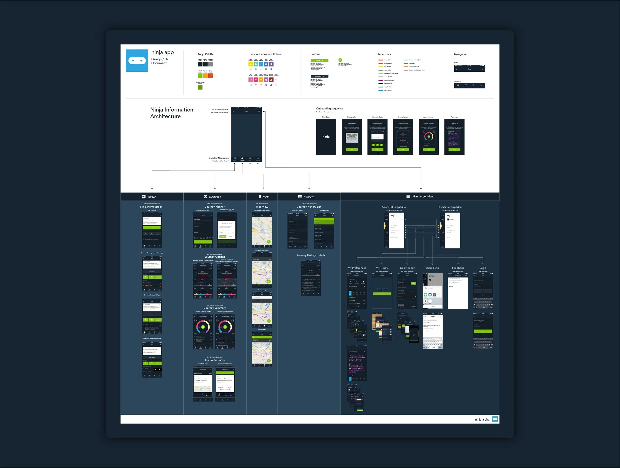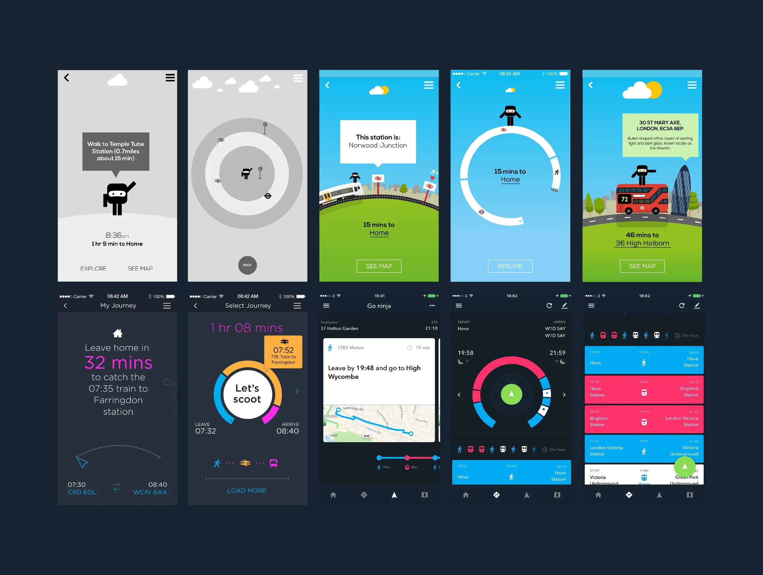 During an ideation workshop we can up with the concept of a ‘scene’ which revolved around a central point. Our character ‘Ninja’ would hover above the modes of transport and give you notifications during your journey. This created a fun and intuitive way to interact with the app.